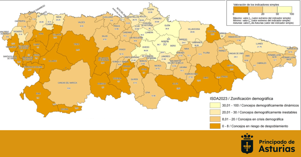 Ese cálculo permite clasificar a los concejos en una escala de cuatro peldaños según su situación demográfica: